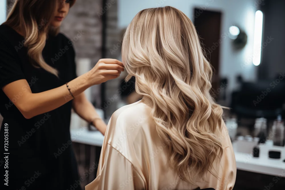 Fototapeta Professional hairdresser working with a client in the beauty salon. Blonde girl getting ready for work. Back view of girl with long hair - do fryzjera - Picturewall.pl