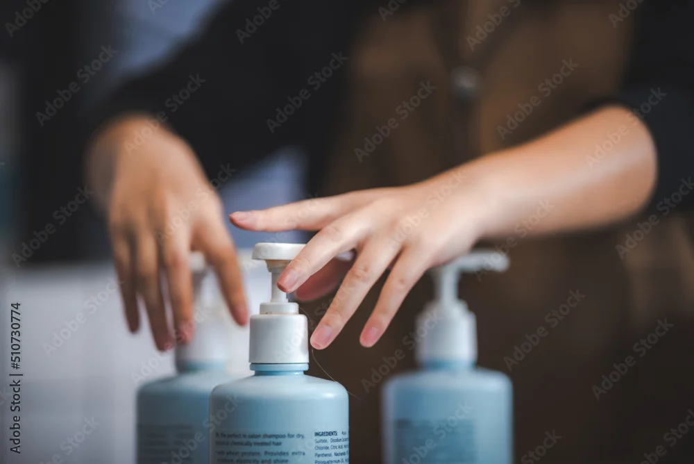 professional woman hairdresser presenting fashion treatment cosmetic shampoo to client person in hair beauty salon, young female using for washing clean head care lifestyle
