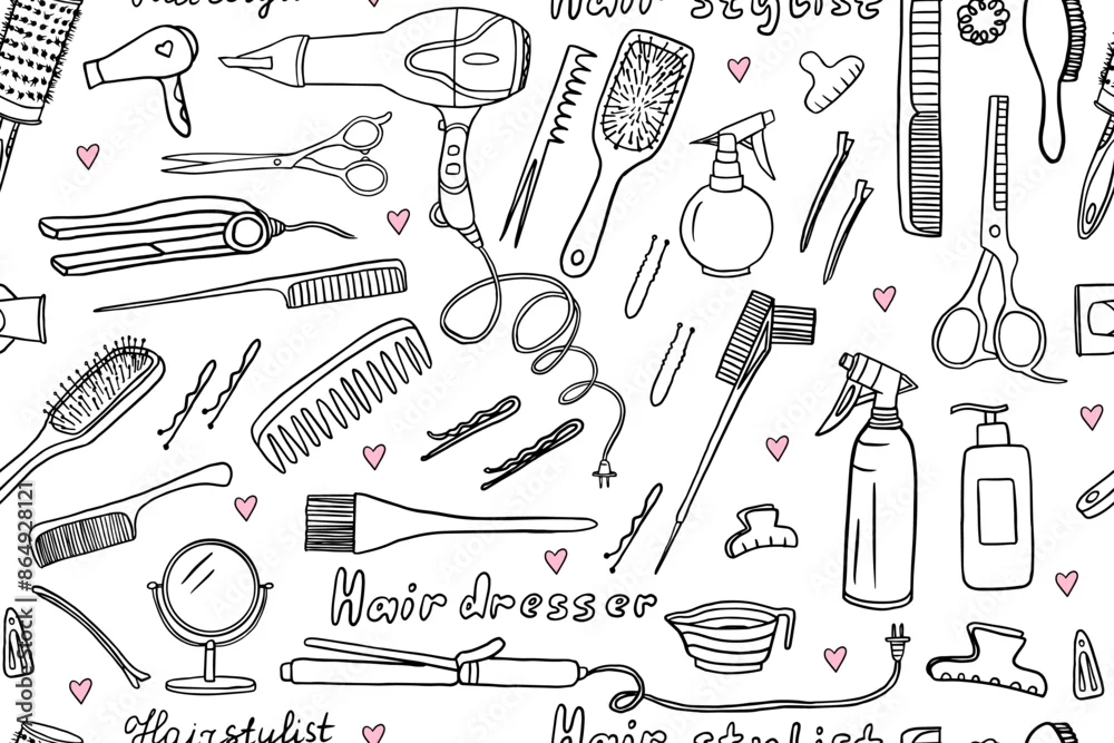 Fototapeta Seamless pattern of hairdresser tools in doodle style. Hair dryer, comb, hair brush, hairpin, invisible, mirror, scissors, hairgrip, hair-slide,shampoo, curling iron. Stylist. Beauty salon. Hand drawn - do fryzjera - Picturewall.pl
