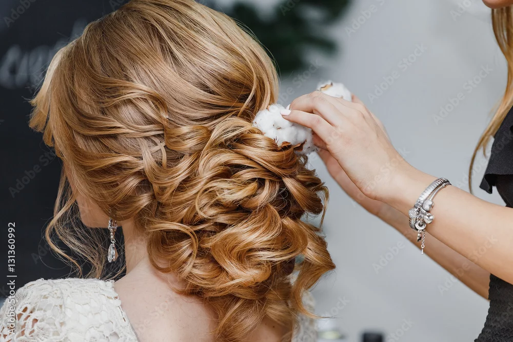 Fototapeta Stylista włosów lub kwiaciarnia sprawia, że panna młoda jest fryzurą ślubną - do fryzjera - Picturewall.pl