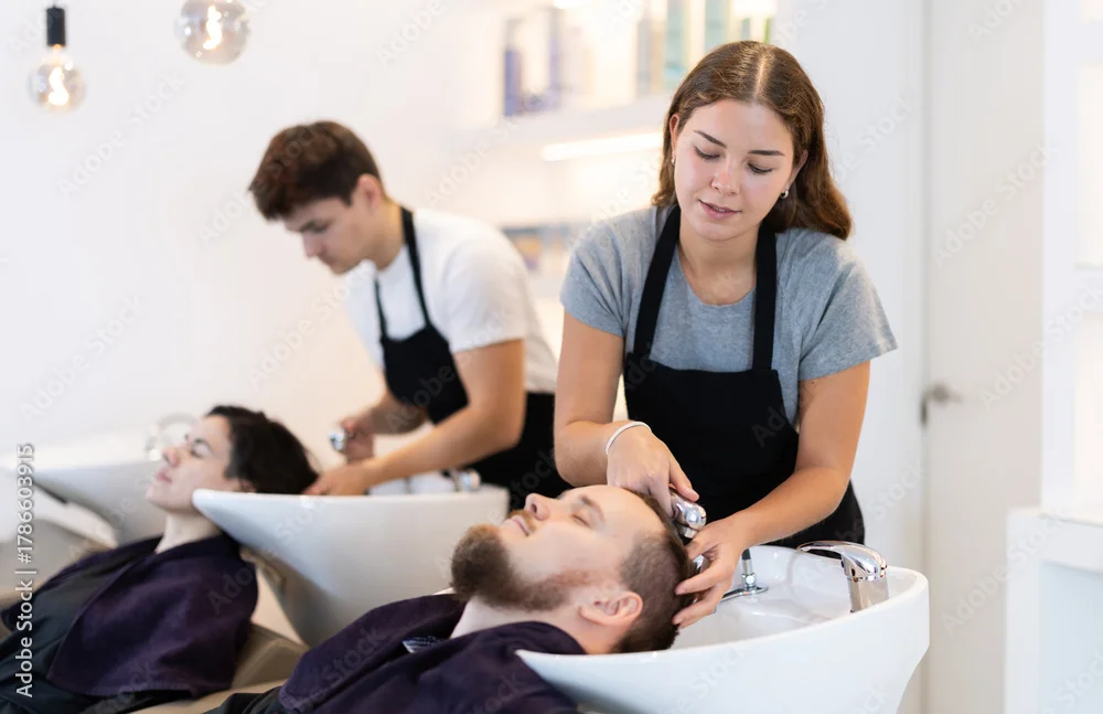 Fototapeta Young female hairdresser stylist washing hair of young male client in beauty salon - do fryzjera - Picturewall.pl