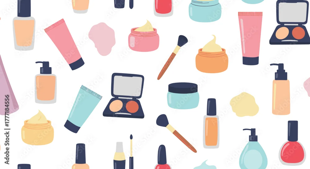 Fototapeta A seamless vector pattern of various cosmetic and beauty products including creams, lotions, makeup palettes, and application brushes.
