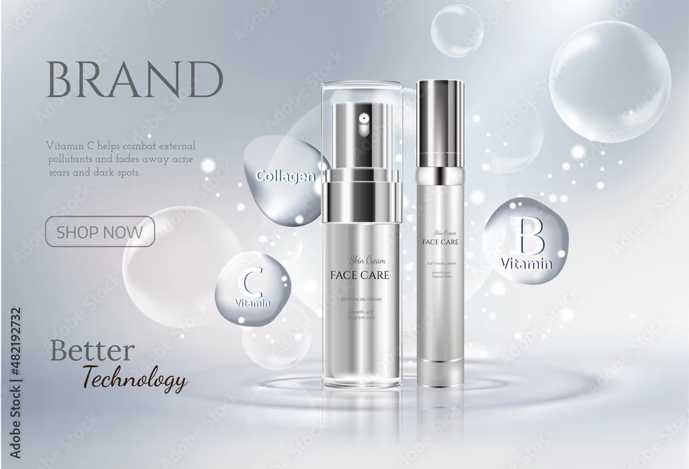 Beautiful cosmetic templates for ads, realistic 3d white tube and silver bottle on a light blue background with water bubbles. Beauty design for premium product