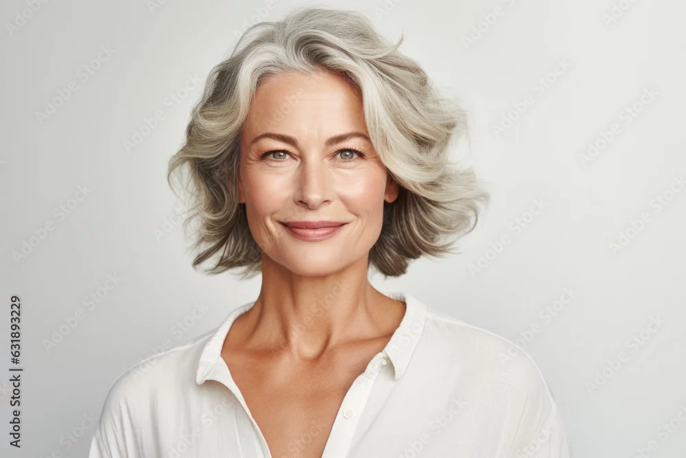 Fototapeta beautiful 50s mid aged mature woman isolated on white background. skin care beauty, skincare cosmetics concept