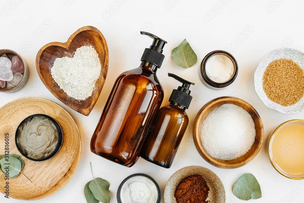 Beauty treatment ingredients for making homemade skin care cosmetic mask. Various bowl with clay, cream, essential oil and natural ingredients on white table background. Organic spa cosmetic products