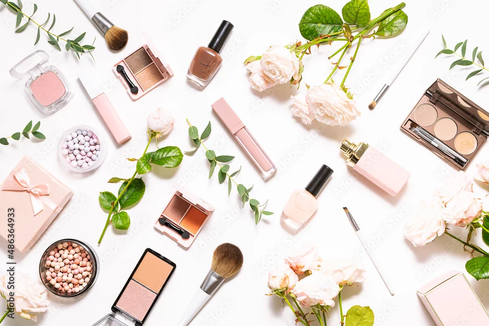 Bright spring composition with assortment of decorative cosmetic products on white background with aromatic roses and eucalyptus leaves top view. Spring cosmetic sale and promo banner.