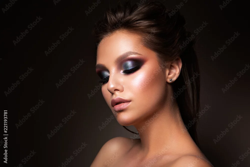 Fototapeta Close-up of beautiful female face with colorful make-up and lips, eyes closed