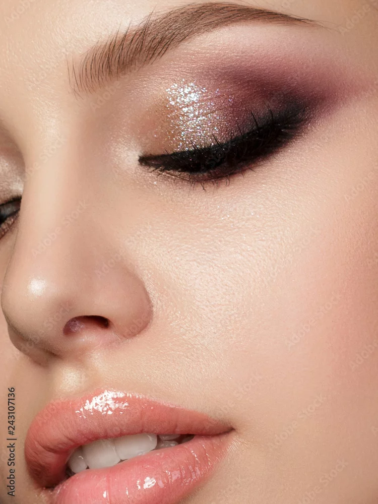 Fototapeta Closeup portrait of young beautiful woman with evening make up. Multicolored smokey eyes. Luxury skincare and modern fashion makeup concept. Studio shot. Extreme closeup, partial face view