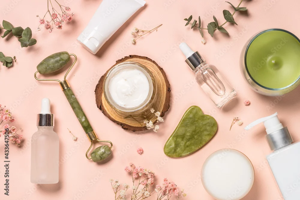 Cosmetic products - Jade roller and gua sha massager with cream and serum bottles at pastel background. Spa background. Top view with copy space.