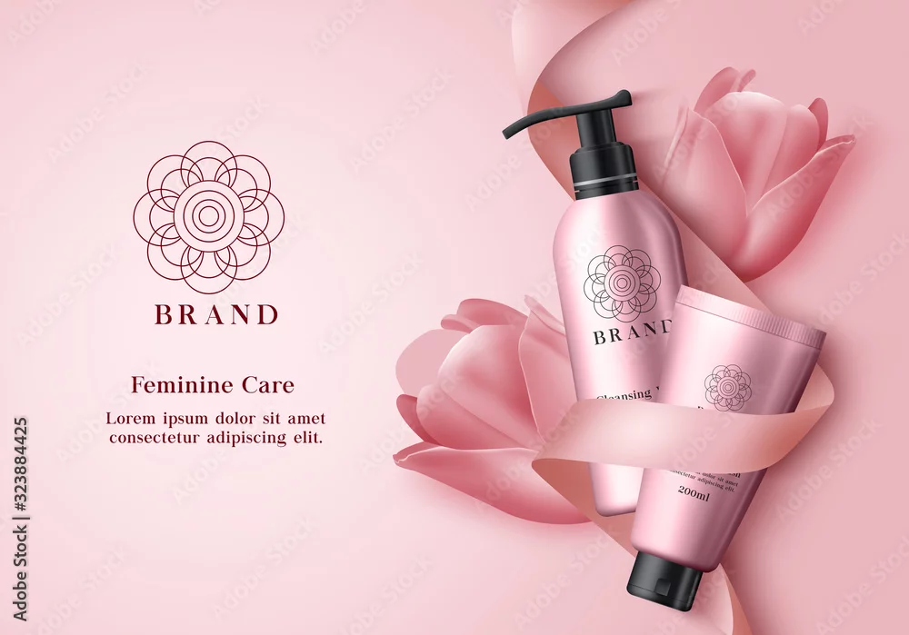 Cosmetic products vector banner template. Feminine product bottles for body skin care with pink tulip flower in elegant background design for promotional purposes. Vector illustration