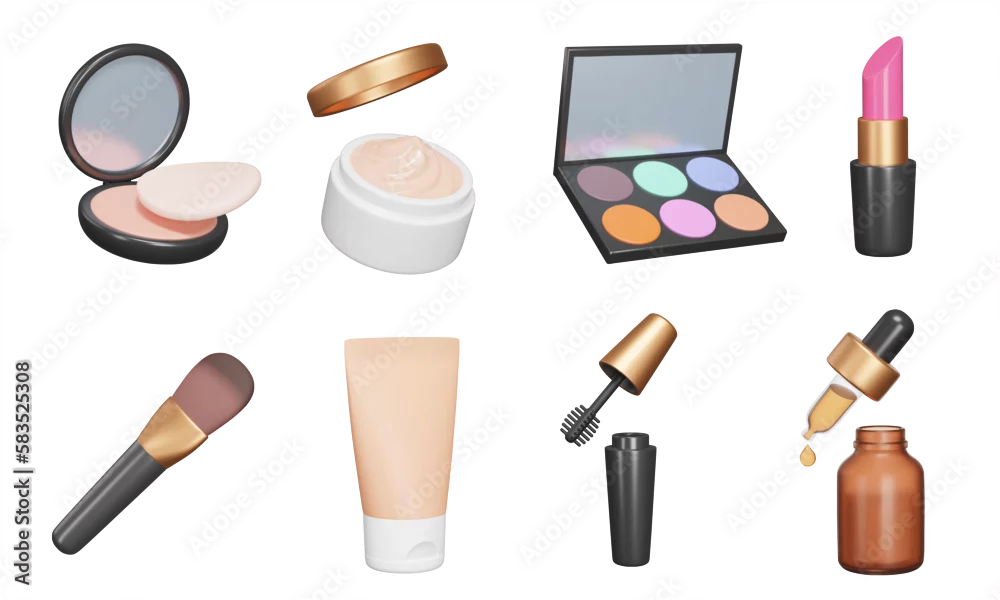 Cosmetics 3d icon set. Perfect look and beauty. powder, cream, makeup tools, lipstick, brush, foundation, mascara, face serum, Isolated icons, objects on a transparent background