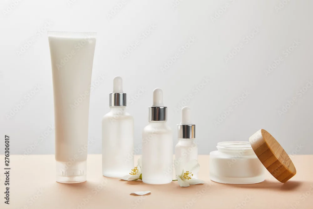 Fototapeta cream tube, cosmetic glass bottles, open jar with cream and few jasmine flowers on beige