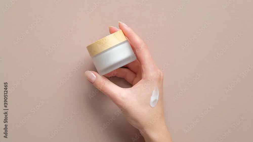 Fototapeta Female hand holding jar of cosmetic cream on pastel beige background. Woman applying moisturizer cream - do gabinetu kosmetycznego - Picturewall.pl