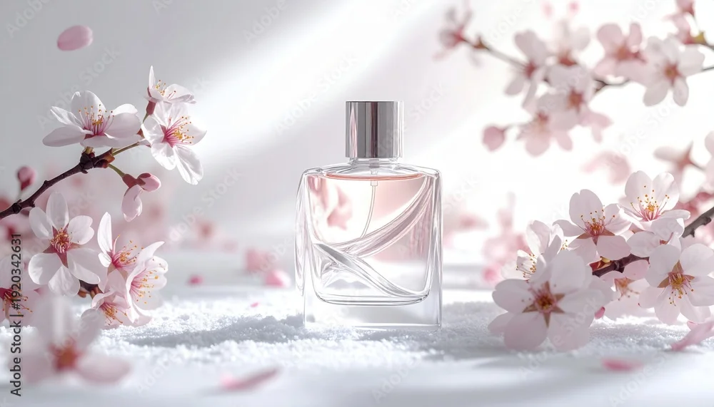 Fototapeta FlyPro Firefly Clear perfume bottle featuring an abstract sculpted design, elegantly surrounded by scattered cherry blossoms resembling snow, captured in a minimalist photography style.