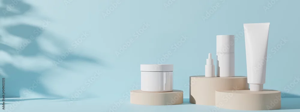 Fototapeta Group of white and blank, unbranded cosmetic cream jars and tubes on blue background. Skin care product presentation. Elegant mockup. Skincare, beauty and spa. Banner with copy space. 3D rendering.