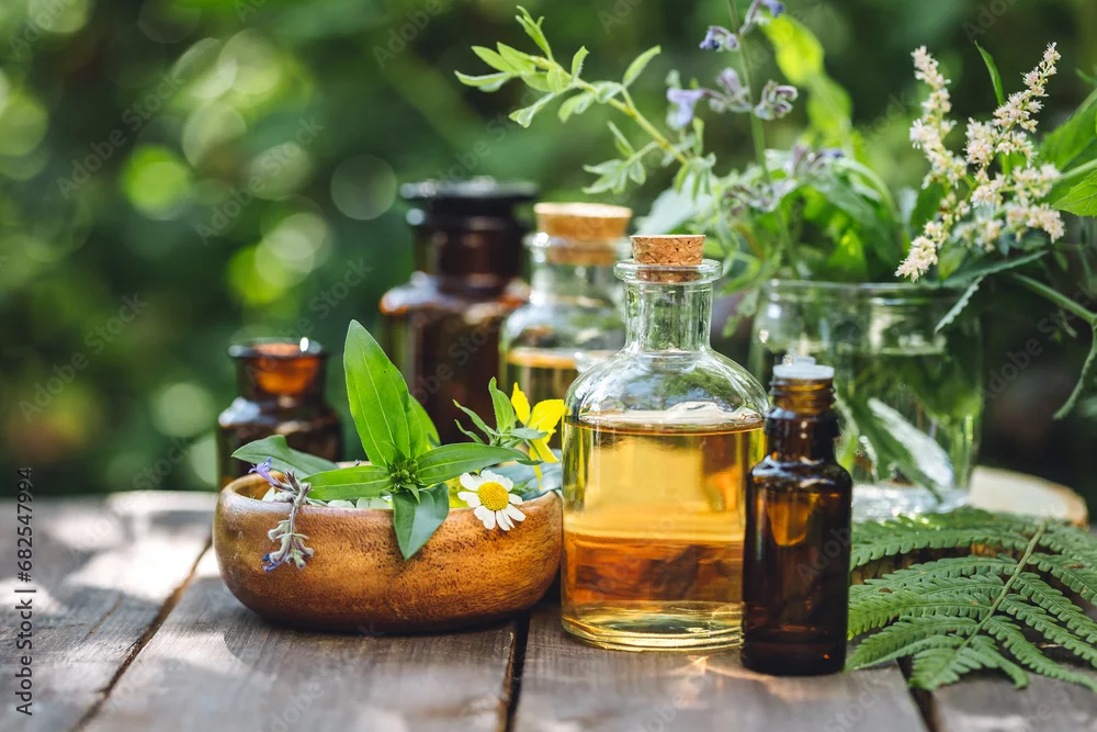 Fototapeta Herbal pure natural cosmetic ingredients on wooden background. Mix of holistic flowers and herbs, salt, massage herb-infused essential oil in glass bottles. Aromatherapy, fragrance production