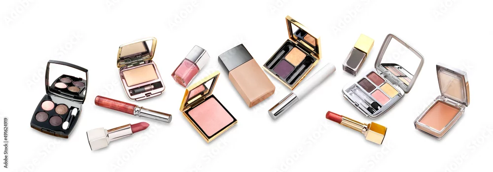 Fototapeta Horizontal set of makeup goods against white background with a soft shadow. Useful for banner.