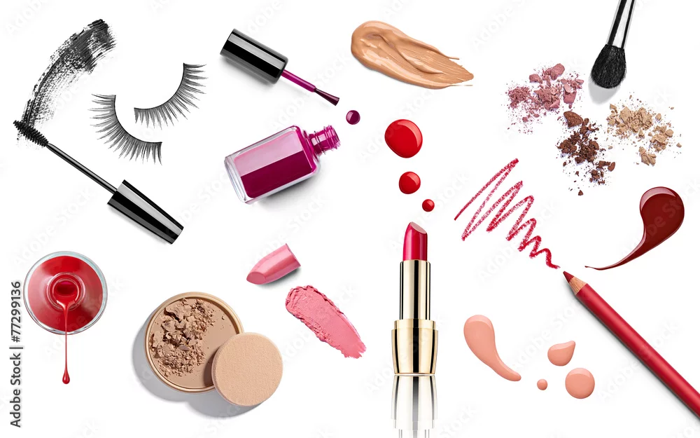Fototapeta make up beauty lipstick nail polish liquid powder mascara pencil - do gabinetu kosmetycznego - Picturewall.pl