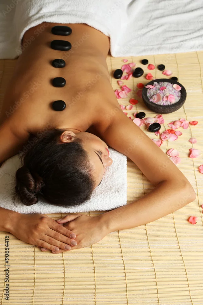 Fototapeta Młoda kobieta z kamykami na ona z powrotem na masażu stole w piękno zdroju salonie