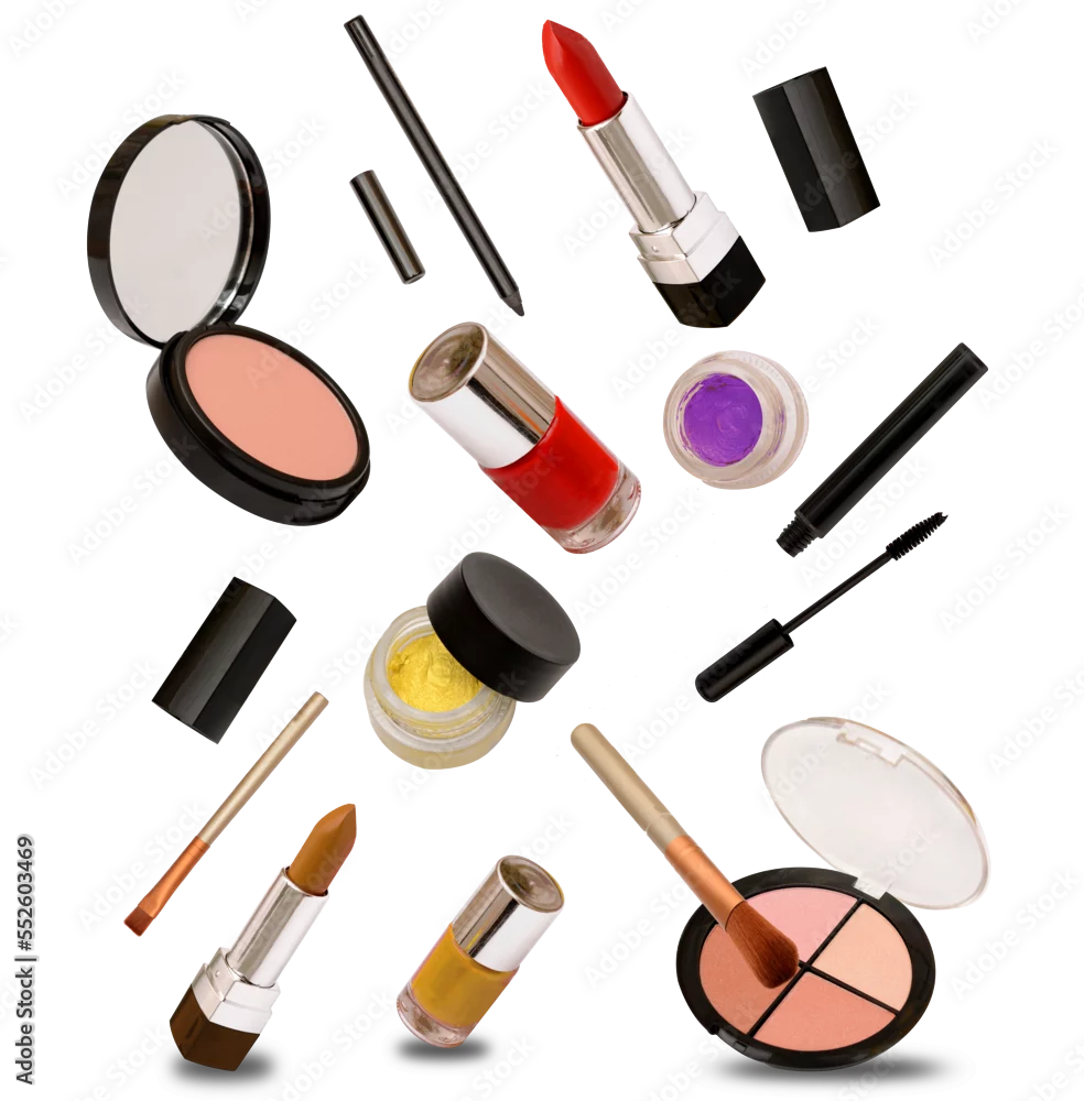 Fototapeta Multiple makeup fashion related items isolated on cutout transparent background