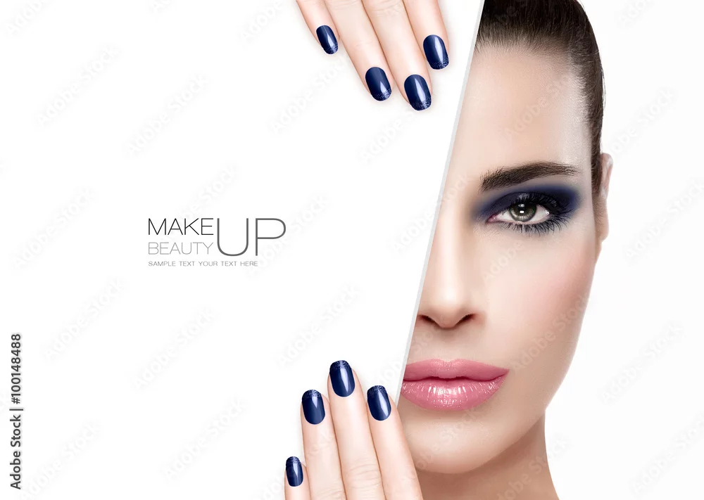 Fototapeta Pojęcie piękna i makijażu. Niebieskie zdobienia paznokci i makijaż