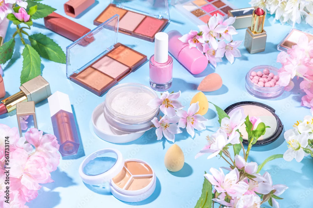 Spring make up set on light blue background. Different make-up professional cosmetics, beauty accessories flat lay with spring blossom flowers top view copy space