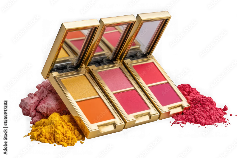 Fototapeta Three luxurious gold compacts of vibrant blush and highlighter makeup isolated on transparent background - do gabinetu kosmetycznego - Picturewall.pl