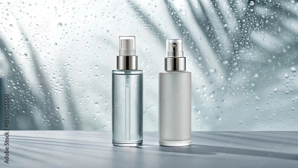 Fototapeta Two cosmetic spray bottles with silver caps sit on a surface against a backdrop of water droplets and palm leaf shadows - do gabinetu kosmetycznego - Picturewall.pl