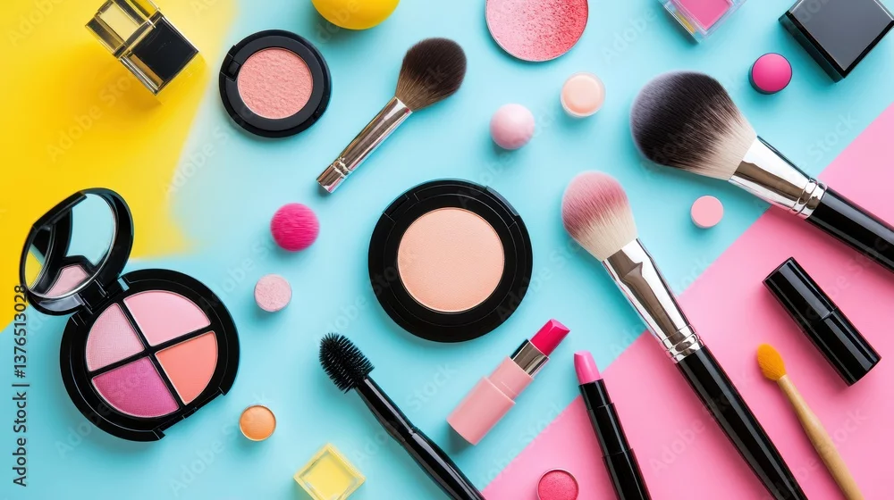 Vibrant Makeup Collection: An artfully arranged collection of makeup essentials, boasting a colorful array of products, brushes and beauty supplies ready to enhance one's natural features