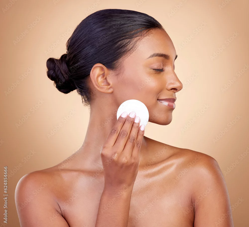 Fototapeta Woman, cotton pad and skincare of face cosmetics for aesthetic wellness on studio background. Happy indian female model, clean beauty and facial dermatology product for makeup removal, shine and glow