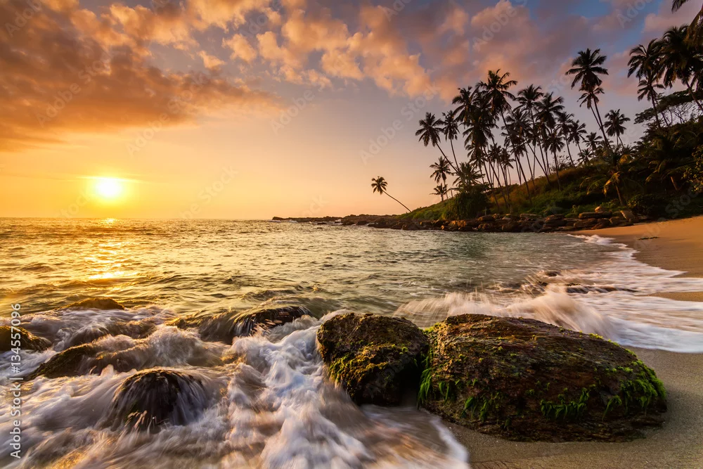 Fototapeta Zachód słońca na plaży z palmami kokosowymi.