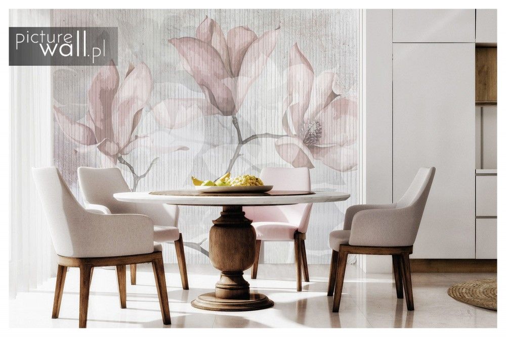 Fototapeta Delikatne magnolie to subtelna dekoracja ścienna, która wnosi do wnętrza atmosferę spokoju i harmonii. Motyw delikatnych, pastelowych magnolii na tle w odcieniach szarości i beżu tworzy przestrzeń pełną naturalnego piękna. Idealnie komponuje się w nowoczesnych wnętrzach, takich jak jadalnia, w której prym wiodą minimalistyczne akcenty. Dzięki wysokiej jakości wykonania fototapeta wyróżnia się trwałością i estetyką, stanowiąc doskonały wybór dla osób pragnących dodać swojemu wnętrzu odrobinę elegancji i spokoju.