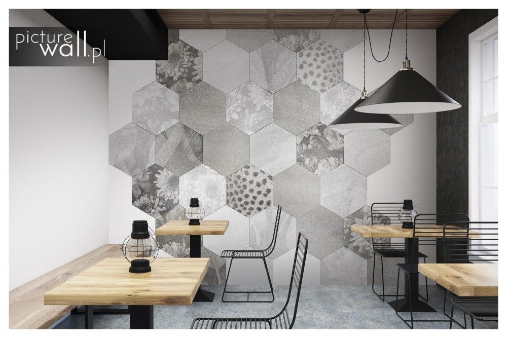 Fototapeta Tropikalne heksagony mono łączy geometryczny wzór heksagonów z subtelnym motywem tropikalnych liści, tworząc nowoczesną i elegancką dekorację. Idealna do biur, przestrzeni kreatywnych czy nowoczesnych jadalni, restauracji i kawiarni, nadaje wnętrzu świeżości i charakteru.