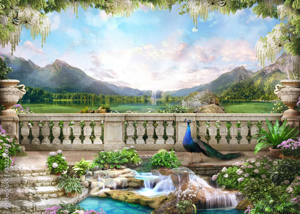 Fototapeta Beautiful view from the flower-covered balcony to the mountain lake and pink sunrise. Digital collage , mural and fresco. Wallpaper. Poster design. - do jadalni - Picturewall.pl