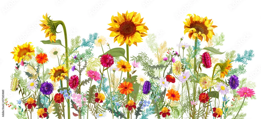 Fototapeta Horizontal autumn’s border: sunflowers, aster, thistles, gerbera, marigold, daisy flowers, small green twigs on white background. Digital draw, illustration in watercolor style, panoramic view, vector