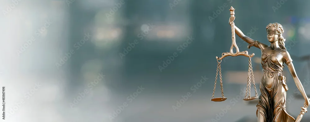 Legal and law concept. Statue of Lady Justice with scales of justice and wooden judge gavel on wooden table. Panoramic image statue of lady justice.