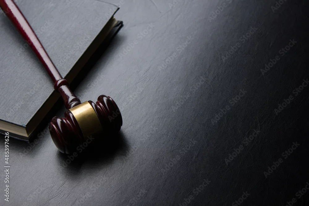 Fototapeta Legal Law and Justice concept - Open law book with a wooden judges gavel on table in a courtroom or law enforcement office. Copy space for text.