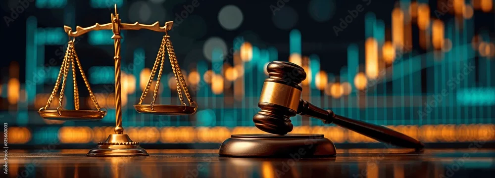 Fototapeta A gavel judge and a law scale are among the financial laws on the stock market exchange board.