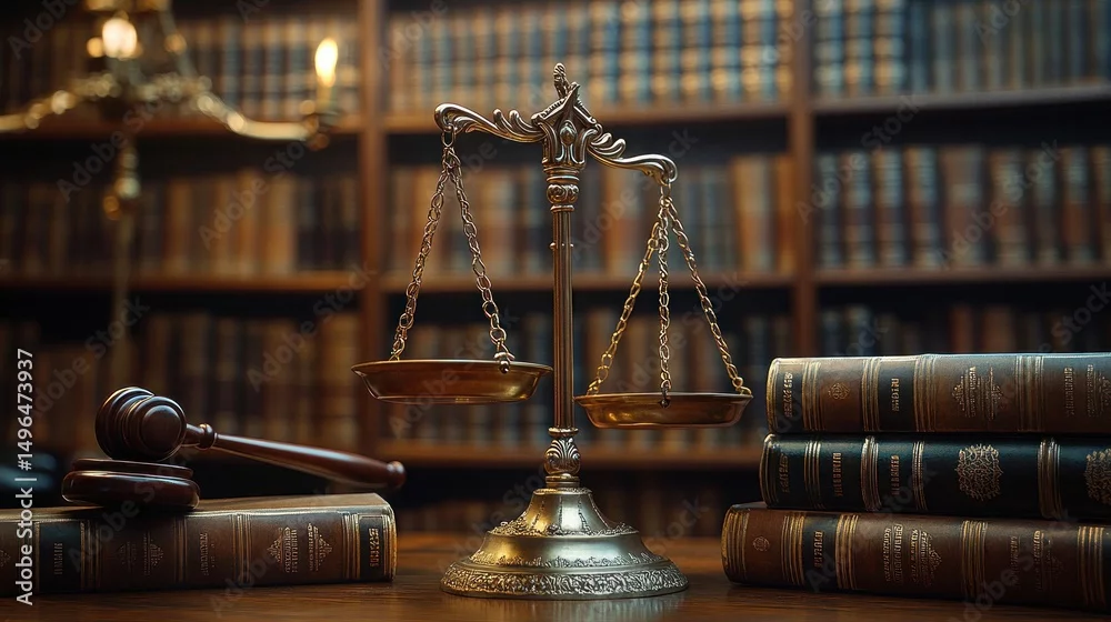 Antique brass balance scale, gavel, and stacked leather-bound law books on wooden desk with library shelves filled with books in the background