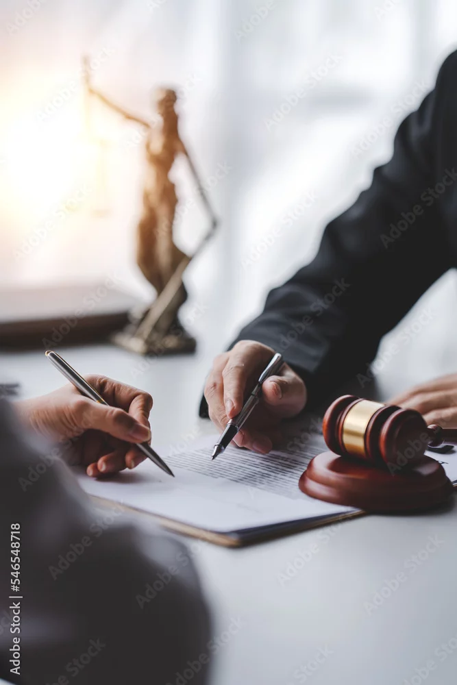 concept of justice and law A male judge in the courtroom on a wooden table and a male counselor or lawyer working in the office. Law, advice and justice concepts.