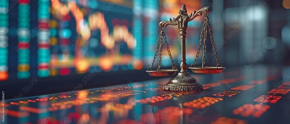 Fototapeta Financial law on the stock market exchange board including a gavel judge and law scale - do kancelarii prawnej - Picturewall.pl