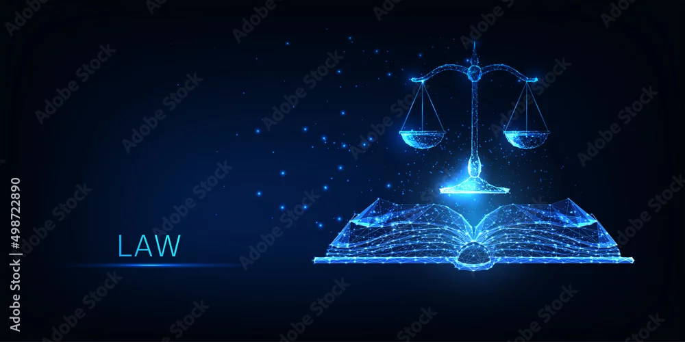 Fototapeta Futuristic justice, law education concept with glowing low polygonal open book and scales
