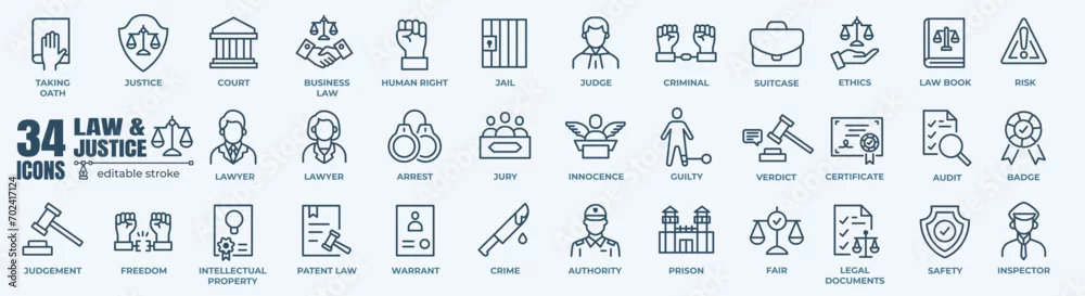 Fototapeta Law and justice minimal thin line web icon set. Outline editable icons collection. Simple vector illustration. - do kancelarii prawnej - Picturewall.pl
