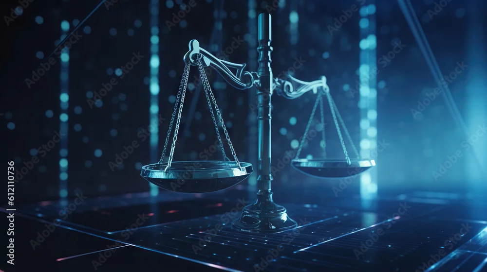 Law scales on background of data center. Digital law concept of duality of Judiciary, Jurisprudence and Justice and data in the modern world. Copy space. Based on Generative AI