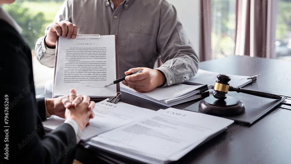 Male lawyer showing contract and pointing the signature box for signing while explaining and consultation about legislation agreement and terms data of business contract to businessman in law firm