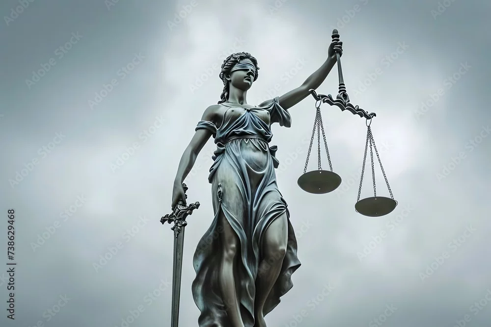 Fototapeta statue of justice holding scales and sword flowing dress eyes blindfolded