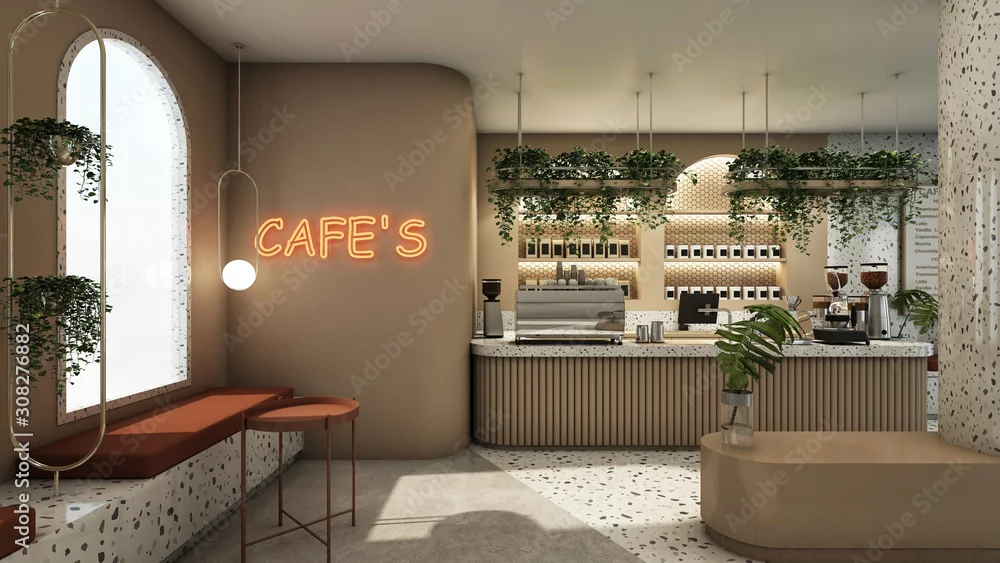 Cafe shop design Modern & Minimal Top Counter Granite stone,Brown counter,Gold metal light pendant, Red neon text cafe on wall,Granite seat,Floor concrete half Granite stone - 3D render