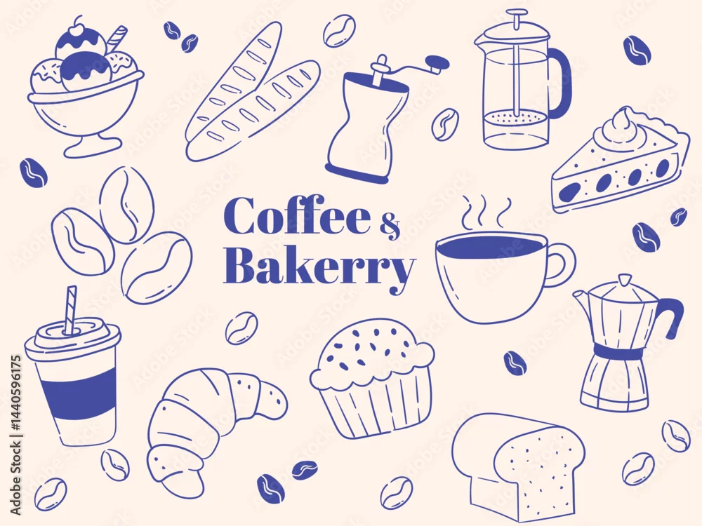 Fototapeta Coffee and bakery doodle illustrations featuring croissants, muffins, coffee cups, grinders, beans, and pie slices, perfect for cafe designs, bakery branding, breakfast menus, and cozy food projects.