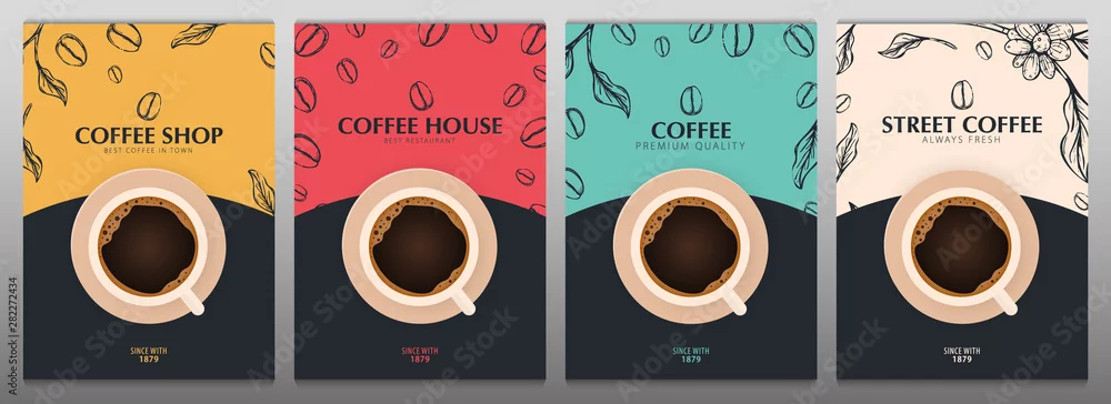 Fototapeta Cup of Coffee. Set of Sketch banners with coffee beans and leaves on colorful background for poster or another template design. - do kawiarni - Picturewall.pl