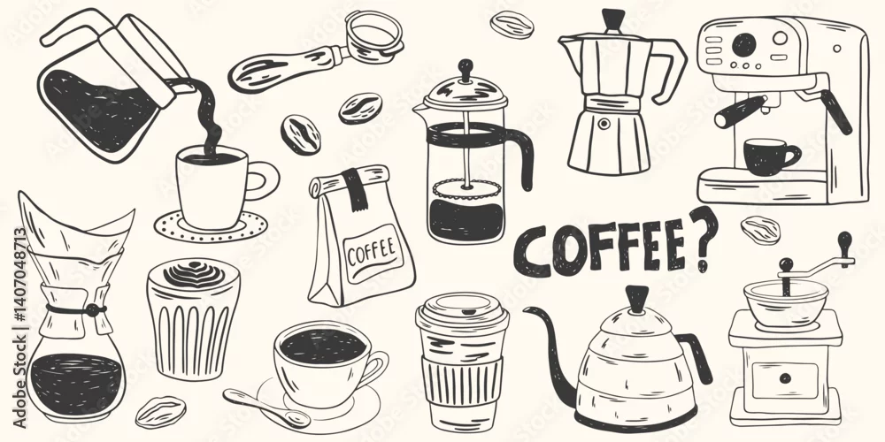 Hand drawn coffee chalk vector illustrations. Minimalist line art. Vector illustration of coffee icons crayon drawing style. Illustration for invitations, menus design, social media. La dolce vita.